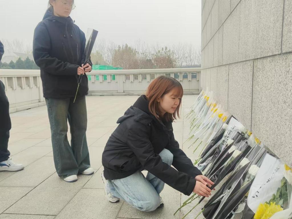 踏入园区,学院师生代表在烈士纪念碑前整齐列队,庄严肃立,脱帽默哀,向烈士们致以最崇高的敬意。彭永刚代表学院为烈士敬献花篮并整理挽联,全体师生沿着台阶缓缓而上,逐一为烈士献花,以此深切缅怀先烈们的丰功伟绩,一束束鲜花,承载着无尽的哀思。