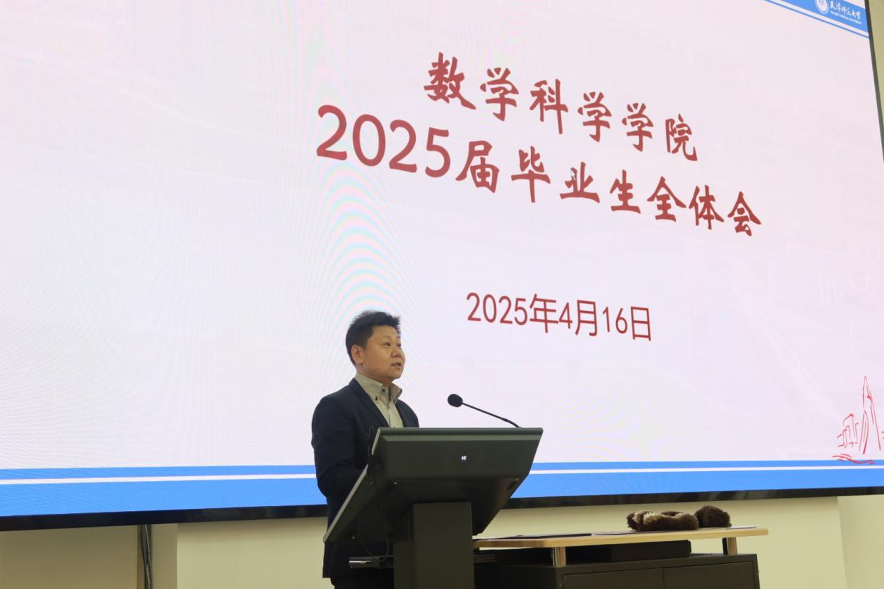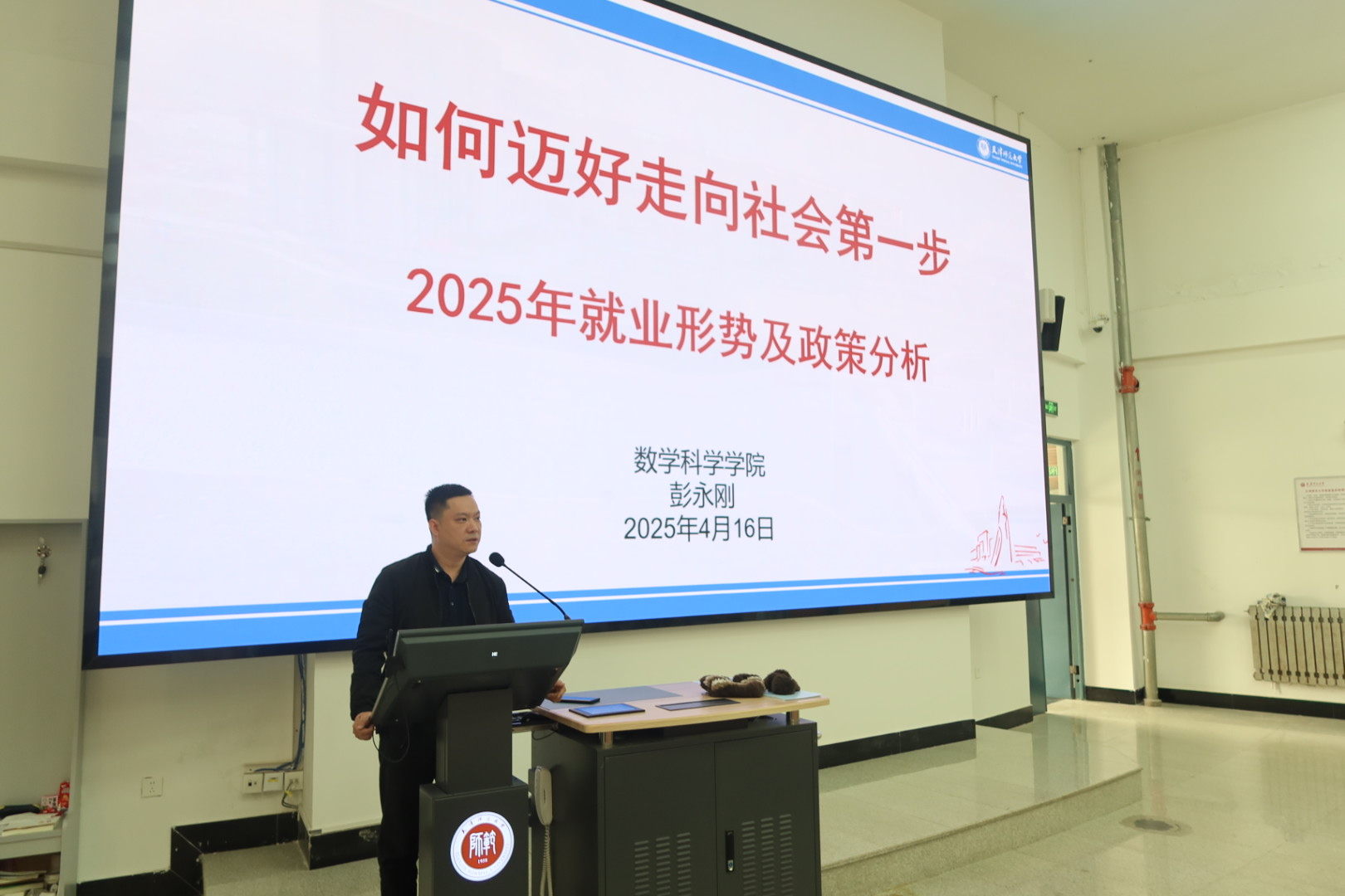 会上,彭永刚围绕当前就业形势、近几年就业数据分析、就业观念转变等进行讲解。他指出,面对当前就业环境,学生需树立“先就业积累经验、后择业优化发展”的务实理念,主动融入国家基础教育、乡村振兴等战略领域。他寄语毕业生:“希望同学们以数学人的严谨思维和创新精神投身社会建设,在未来的职业生涯中不断奋斗,书写属于自己的精彩篇章,在服务国家需求中实现人生价值。”