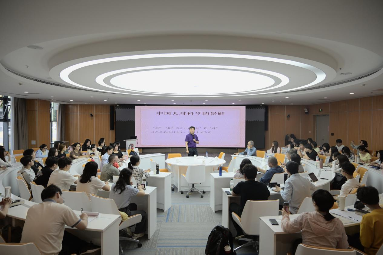 报告会上,吴国盛从科学的起源讲起,强调科学精神是追求真理的精神,要求真、讲是非,不计利害。他深入对比中西文化,阐述中国文化是血缘、亲情文化,崇尚“仁-礼”;西方文化是地缘、契约文化,追求“自由-科学”,他从哲学角度阐释科学本质上是一种人文的原因,从中西文化对比的角度解析中国古代为什么没有发展出近代科学。他鼓励青年学生,特别是师范院校的学生要深刻理解科学精神,为我国取得更多的原创性成果做出教育贡献。