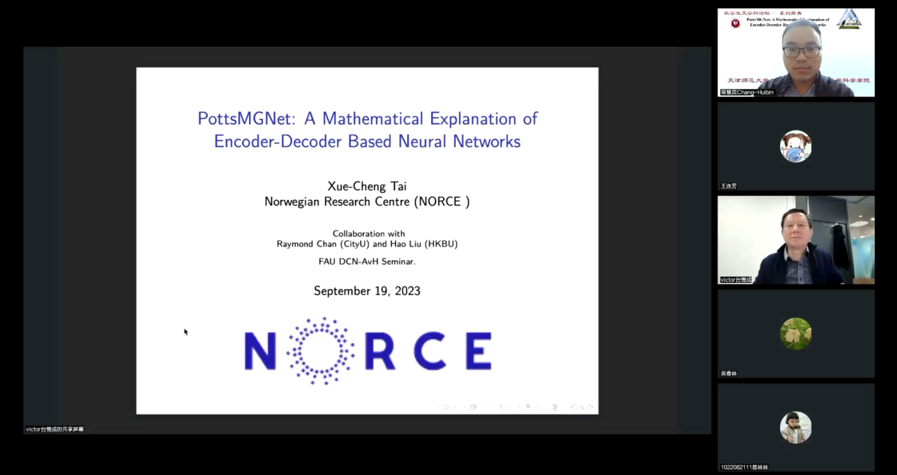 台雪成教授是计算数学和数学图像处理的国际领军学者,近年来在机器学习和深度学习方面取得了一系列突破,这次报告的题目是PottsMGNet: A Mathematical Explanation of Encoder-Decoder Based Neural Networks 。聚焦深度学习方法的可解释性,台教授和合作者独辟蹊径,从图像分割的Potts模型出发,建立了分割问题与控制问题深度联系,进一步使用多重网格方法和算子分裂算法对连续控制模型进行离散化求解,进而导出了具有高度可解释性的稳定有效的PottsMGNet方法。报告结束后,参会师生踊跃提问,台雪成教授耐心得解答了大家的问题,并指出了新方法将来的发展方向。