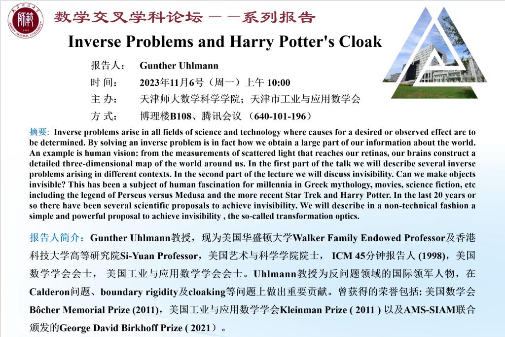 【预告】学术报告(2023-35)11月6日—Inverse Problems and Harry Potter's Cloak